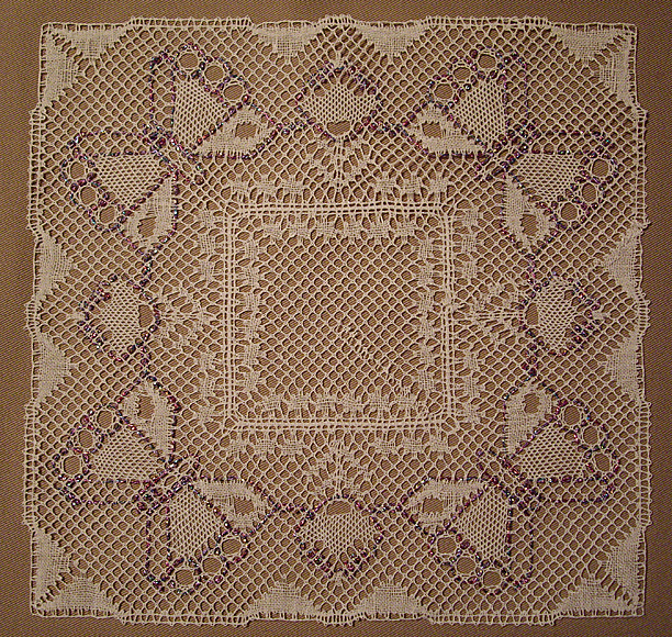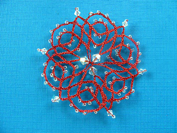 Beverly used Bockens 35/2 linen with a varigated metallic thread for the gimp. Approximate size: 8 1/2 inches square. Submitted by Beverly D.